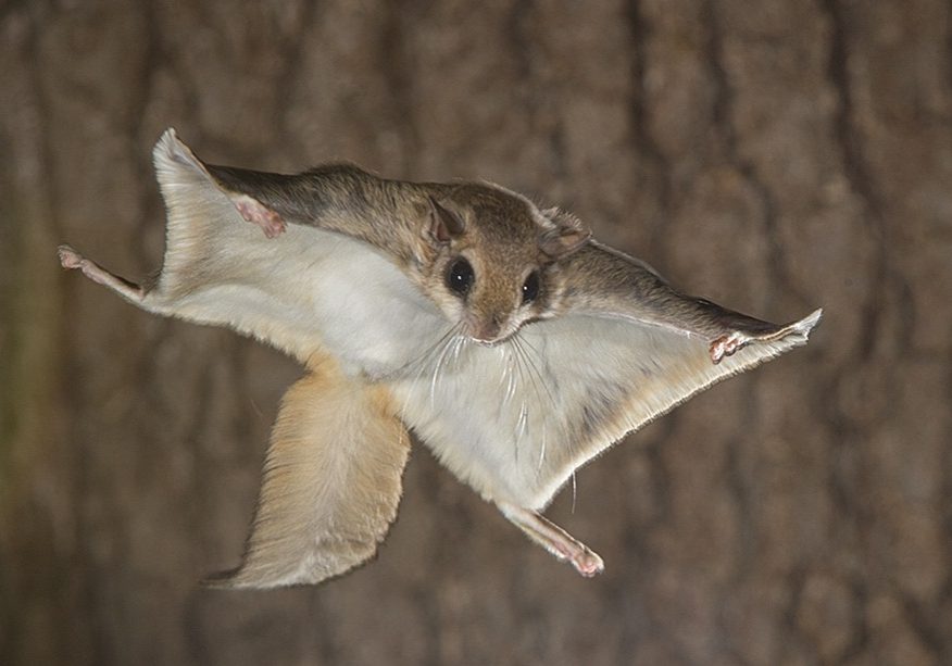 a small animal like a squirrel that travels through the air between trees, spreading out the skin between its front and back legs to stop itself from falling too quickly