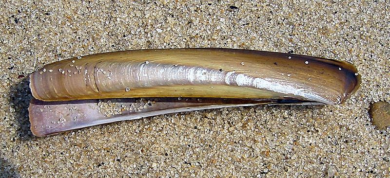 a shellfish that can be eaten. It has a long thin shell in two parts that can open and close